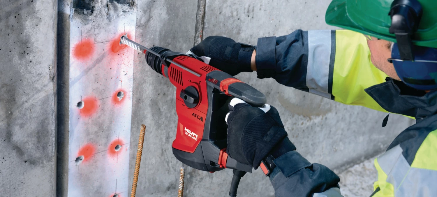 Perçage de trous pour le scellement de fers à béton, plage de diamètres : 4 à 28 mm, plage recommandée : 10 à 20 mm