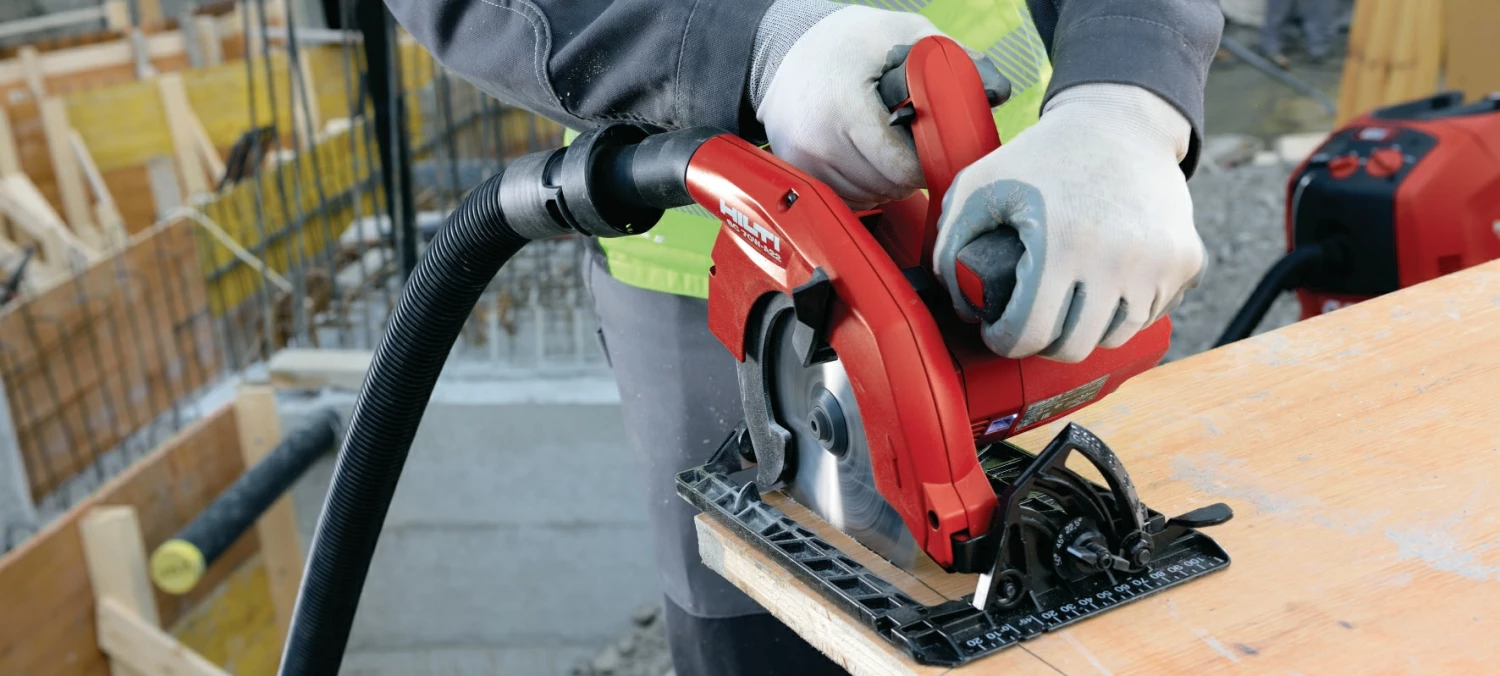 Entièrement compatible avec le rail de guidage – cette scie circulaire portative permet une coupe précise à des angles de 45 et 90 degrés.